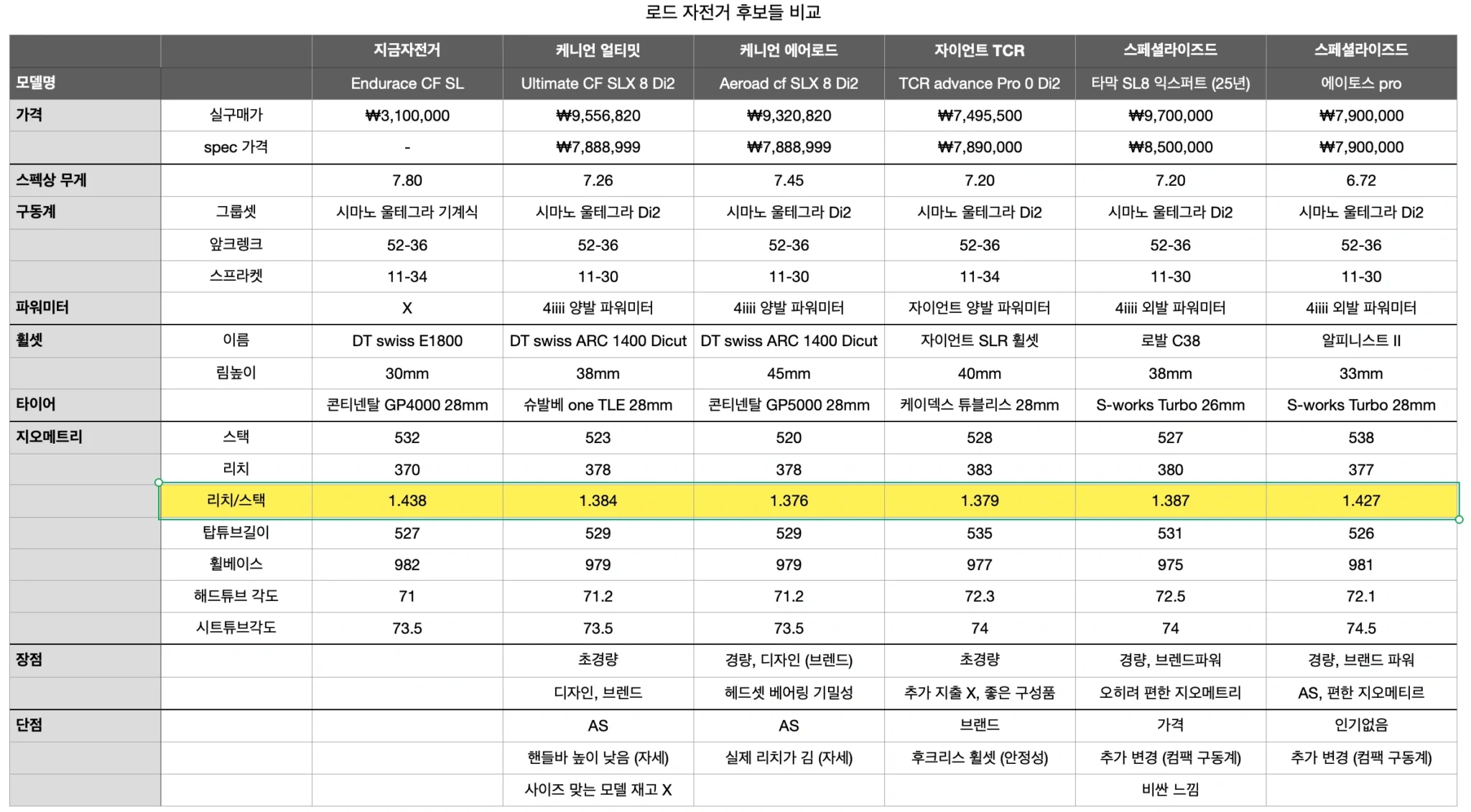 아래는 제가 자전거 선택을 하기 위해 계산하였던 주요 구매 대상 자전거별 지오메트리 비교 차트입니다.